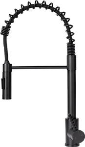 Product Description: Flow-Max 2021090598 Coiled Spring Sprayer Faucet, Black This coil-spring kitchen sink faucet features a flexible, pull-down style, as well as spray and stream functions that let you effectively rinse and clean. High-quality materials give this faucet a high-end look and feel, and the single-handle design offers ease of use.