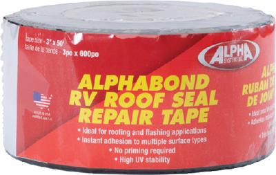 Product Description: Alpha Systems 862408 All-Purpose Butyl Tape, 3" X 50", White The go-to tape for your next RV roofing project. Pressure-sensitive, it has an aggressive instant tack adhesive. Wood, metal, fiberboard, ISO board, and concrete, as well as EPDM, TPO, PVC, and mixed elastomer roofing membranes you name it, it adheres to it. Used to seal roof joints and seams, as well as tears, punctures, leaks, and other dama. Plus, it features a UV-stable TPO facer that makes it ideal for flashing.