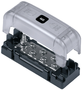 Product Description: Marinco ATC 6 Way Bus Bar Includes contour lock system which allows you to module as many fuse holders as you like together. Link inputs together or split them apart to allow multiple power groups within one fuse holder. Includes a clip on cover with label positions. Max. amp. per circuit-30, Max. amp per block-100, Max volts-32VDC.