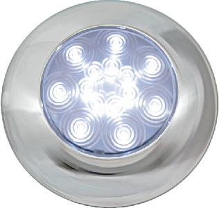Product Description: Anderson LED Dome/Interior Light - Chrome 14 high-output Great White® diodes for bright illumination for interior applications. Operating range is 9-16 volts. Mounts on 2-3/16" centers with two hardwired leads.