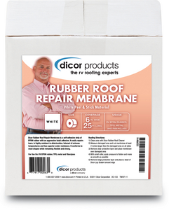 Product Description: Dicor EPDM Rubber Roof Repair Membrane, 6" x 25' Repairs punctures, tears and breaks in EPDM rubber, TPO plastic, metal and fiberglass roofing. This easy to use peel and stick material is made of self-adhering EPDM rubber and conforms to most shapes and surfaces, yet remains flexible and strong.