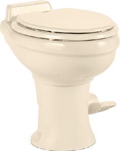 Product Description: Dometic 320 Series Standard Height Toilet w/o Sprayer, Bone Available in a standard and a low-profile height, the 320 Series of toilets are designed specifically with home comforts in mind. Offering unsurpassed amenity with an elongated and deep ceramic bowl and an enameled wooden seat. The ergonomic one-direction foot pedal action results in easy, hands-free flushing for added sanitary benefits.