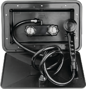 Product Description: Dura Faucet DFSA170BK Exterior Shower & Box Kit, Black Shower box kit contains space saving 90° swivel elbow, UV protected, 60" vinyl hose, synthetic waterways, mounting cutout: 11" x 6".