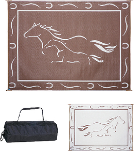 Product Description: Ming's Mark Reversible Mat, Brown/White, Galloping Horses, 8' x 11' This reversible mat can be used indoors or outdoors; at home on the patio; next to your RV; in the park, garden or at picnics; while camping; or at the beach. It can also be used under pet cages and in exercise pens. Easily clean it with a broom or water sprayed from a hose. The woven construction dries quickly to prevent mold and mildew. The durable polypropylene material is coated with UV protection to resist sun damage and fading. Corner loops can be staked to hold it in place. The mat folds into a compact size for storage and comes with a nylon carry bag. Breathable material won?t damage grass