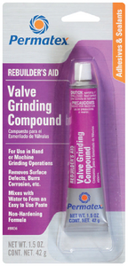 Product Description: Permatex 80036 Valve Grinding Compound, 1.5 oz. Aids valve grinding and seating operations to remove burrs, surface defects, carbon, gum, and corrosion. Mixes with water to form an easy to use paste.