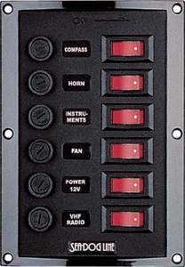 Product Description: Sea-Dog 4241101 6-Gang Vertical Rocker Switch Fuse Panel Vertical 6-Gang Rocker Switch Panel is constructed of fire resistant injection molded nylon. These panels are suitable for use in engine room compartments. Features six 15A 12VDC illuminated SPST On/Off rocker switches and six fuse holders for use with standard AGC 1/4 x 1-1/4 glass style fuses. Individual circuit 10A max. 37A total. 12VDC. Includes a sheet of 20 preprinted decals to customize to your specific applications. Installs with six #6 RH fasteners (not included). Meets CE specifications.