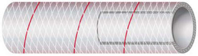 Product Description: Shields Marine Hose Clear Reinforced Series 162 PVC Tubing with Red Tracer For pressurized water system supply, washdown pump connections, and head intake hose. Clear, heavy duty wall, polyester braid reinforced PVC. Use hose w/blue tracer for cold water applications, use hose w/red tracer for hot or cold water applications. FDA formula vinyl. 250 psi burst pressure.