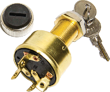 Product Description: Sierra MP39070 Conventional 4 Position 1" Brass 4 Screw Terminal 12V 15 Amp Ignition Starter Switch Brass Switches: Traditional corrosion resistant construction. Does not include push to choke. Includes boot and 7/8" Mtg hole. 4 Position (Accessory-Off- Ignition-Start). 30 Amp Solenoid.