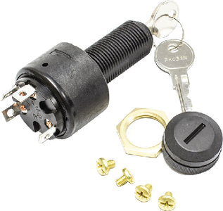 Product Description: Sierra MP41040 Conventional 4 Position 1 1/8" Polyester 4 Screw Terminal 12V 15 Amp Ignition Starter Switch Brass Switches: Traditional corrosion resistant construction. Does not include push to choke. Includes boot and 7/8" Mtg hole. 4 Position (Accessory-Off- Ignition-Start). 30 Amp Solenoid.