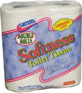 Product Description: Valterra Softness Double Rolls The perfect RV toilet tissue, it's 2-ply and embossed for softness. Most importantly for your RV this paper has been rigorously tested for quick break down ensuring a clog-free RV waste tank. Also good for Marine tanks and safe for all septic systems!