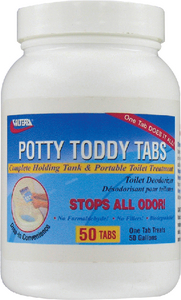 Product Description: Valterra Q5004 Potty Toddy Tabs Non Toxic RV Toilet Odor Neutralizer Tablets No mess, no measuring, easy to store. Treats 50 gallons, lubricates valve seals. Liquefies waste and all types of toilet paper. Neutralizes odor completely, unscented. Environmentally safe, non-toxic, no formaldehyde.