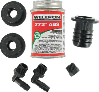 - 1-1/4" Straight barbed fill, two drain nuts 3/8" FPT, 1/4 pint solvent cement, one pipe plug 3/8" MPT